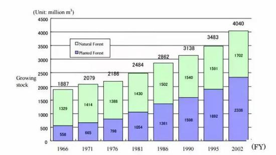 根据联合国粮食及农业组织发布的日本林业政策研究报告的统计数据显示,从1966年到2002年,日本森林蓄积量从19亿立方米增加至40亿立方米。其中,人造林蓄积量从5.6亿立方米上升至23.4亿立方米。