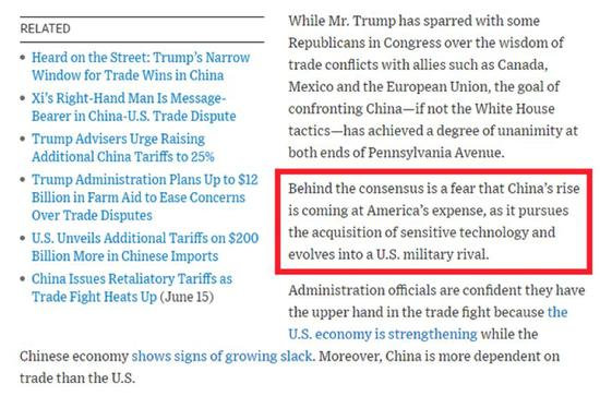 《华尔街日报》还指出说,美国总统特朗普要对抗并遏制中国的做法一定程度上获得了国会的“一致认同”。而这种“共识”,源自一种“恐惧”心态,即认为中国的崛起建立在美国的痛苦和损失之上,而且这种崛起会威胁到美国的地位。