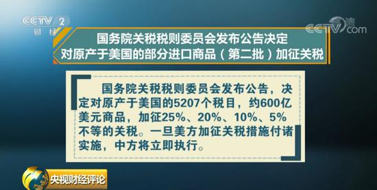 北京时间8月2日凌晨,美国贸易代表办公室发布声明,考虑对2000亿美元中国商品征税的税率从10%提升到25%。作为反制措施,国务院税则委员会3日晚上发布公告,决定对原产于美国的5207个税目,大约600亿美元商品,加征25%、20%、10%和5%不等的关税,一旦美方加征关税措施付诸实施,中方将立即执行。