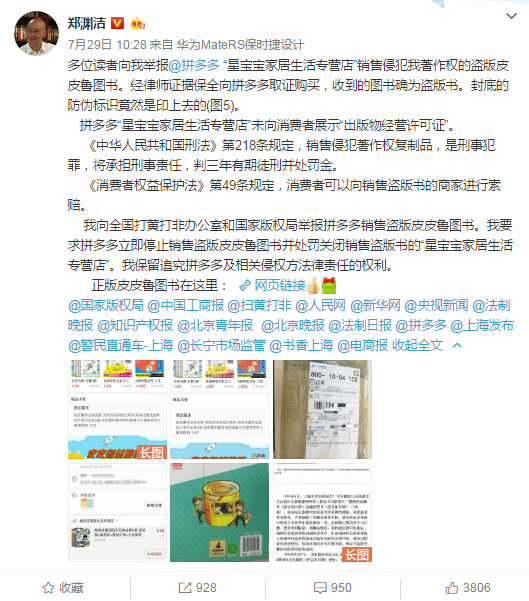 7月29日,“童话大王”郑渊洁发布微博称,多位读者举报拼多多平台上的专营店销售盗版皮皮鲁图书。