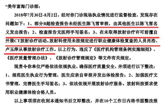8月5日晚,美年健康发布公告,广州美年富海门诊部收到广州市天河区卫生和计划生育局《责令整改通知书》,证实了美年健康美年富海门诊部存在冒名医生、体检报告无医师手写签名、违规开展CT放射诊疗活动等三大违规行为: