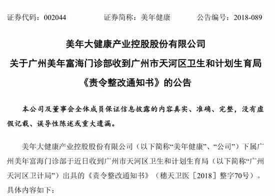 美年健康在8月5日晚的公告中表示,在收到《责令整改通知书》后,第一时间派驻专项工作小组进驻广州美年富海门诊部,进行深度调查,并逐步落实整改。