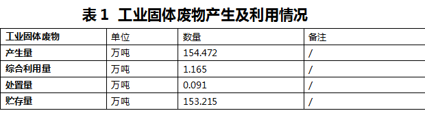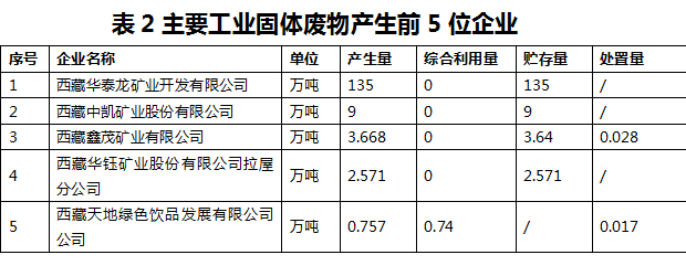 2017年,全市工业固体废物产生量为154.472万吨,其中:综合利用量1.165万吨,综合利用率为0.754%;处置量0.091万吨、贮存量153.215万吨。从统计结果分析,拉萨市工业固体废物主要包括尾矿、建材行业废物、酿造行业废物、食品加工废物等,其中以尾矿为主。工业固体废物产生及利用情况、主要工业固体废物产生量位于前五位的工业企业分别见表1 、表2。