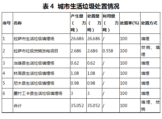 拉萨市生活垃圾卫生填埋场位于曲水县聂当乡,占地面积300亩,库容量190.28万m3,日处理垃圾700吨。拉萨市市区、达孜县、堆龙德庆区、曲水县生活垃圾运入垃圾填埋场进行填埋处理,其他各县(区)目前都建有生活垃圾填埋场,生活垃圾均进行填埋处理。根据拉萨市环境卫生管理局及各县(区)相关部门提供的相关数据显示,2017年,拉萨市生活垃圾产生量35.052万吨,生活垃圾清运量35.052万吨,清运率100%;生活垃圾填埋量32.366万吨;生活垃圾焚烧量2.686万吨,回收利用量为0.558万吨,利用率1.592%;无害化处置率为100%。