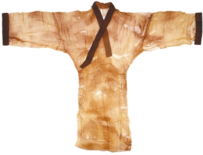 长沙马王堆一号汉墓出土329—6号直裾素纱单衣衣长128厘米,两袖通长190厘米,是上衣下裳连缀的深衣样式,右衽交领、直裾。以素纱为衣料,几何纹绒圈锦为缘饰,其方孔纱的织物孔眼均匀,布满整个织物表面,织物密度稀疏,经线密度为每厘米58根,纬线密度为每厘米40根。因此素纱孔眼大,透光面积在75%以上,每平方米织物仅重12克,质地轻柔透亮,古诗形容为“轻纱薄如空”。