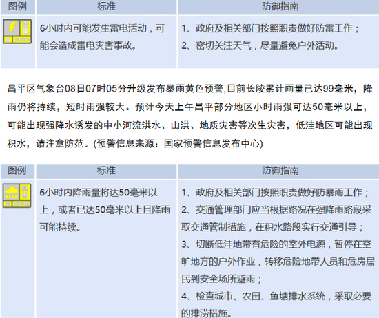 昌平区气象台08日07时05分升级发布暴雨黄色预警,目前长陵累计雨量已达99毫米,降雨仍将持续,短时雨强较大。预计今天上午昌平部分地区小时雨强可达50毫米以上,可能出现强降水诱发的中小河流洪水、山洪、地质灾害等次生灾害,低洼地区可能出现积水,请注意防范。(预警信息来源:国家预警信息发布中心)