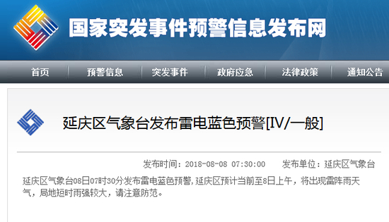 延庆区气象台08日07时30分发布雷电蓝色预警,延庆区预计当前至8日上午,将出现雷阵雨天气,局地短时雨强较大,请注意防范。(预警信息来源:国家预警信息发布中心)