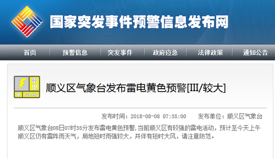 顺义区气象台08日07时35分发布雷电黄色预警,当前顺义区有较强的雷电活动,预计至今天上午顺义区仍有雷阵雨天气,局地短时雨强较大,并伴有短时大风,请注意防范。(预警信息来源:国家预警信息发布中心)
