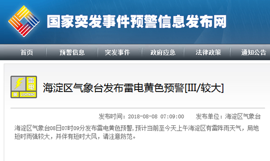 海淀区气象台08日07时09分发布雷电黄色预警,预计当前至今天上午海淀区有雷阵雨天气,局地短时雨强较大,并伴有短时大风,请注意防范。(预警信息来源:国家预警信息发布中心)