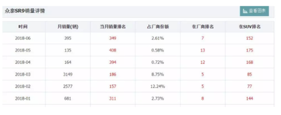 但是好景不长,在“10万开保时捷”的泡沫破灭以后,S系列销量呈现断崖式的下跌。据车主之家公布的数据,今年6月众泰SR9销量仅为395辆,SR7更是跌至历史最低的103辆。