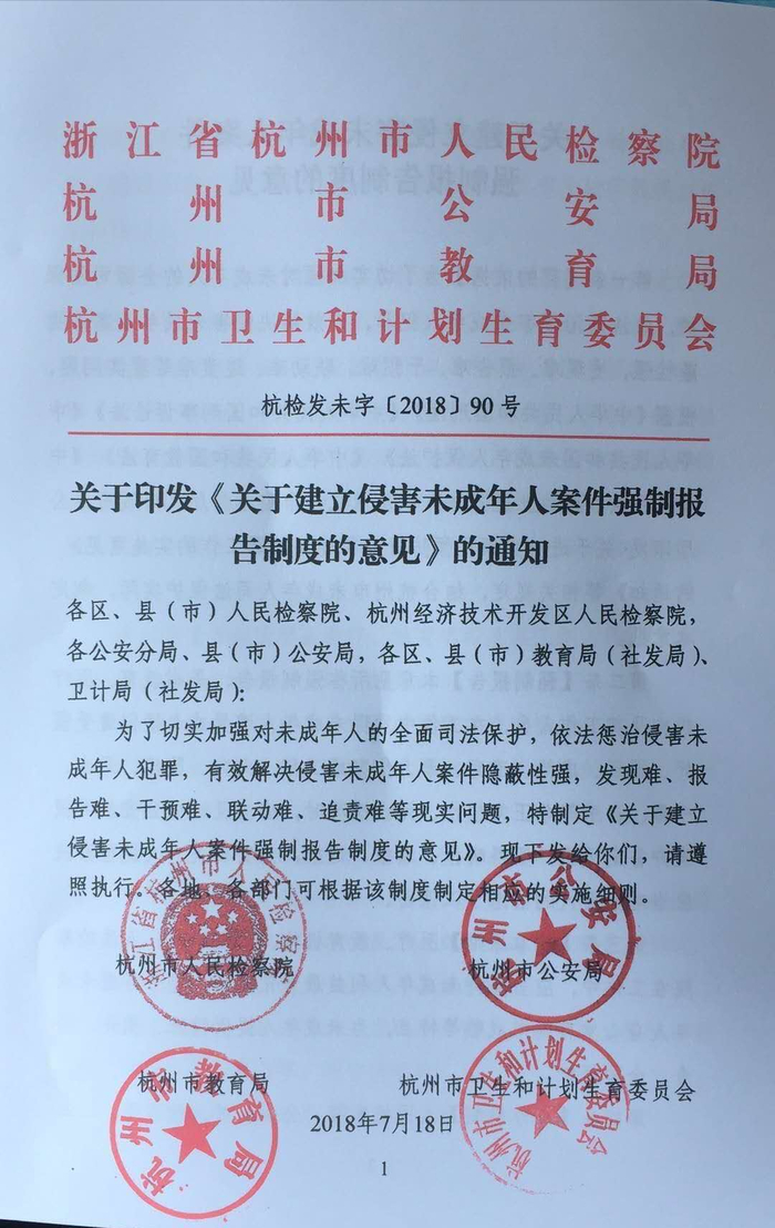 浙江省杭州市检察院、杭州市教育局等四家市级单位联合发布的《关于建立侵害未成年人案件强制报告制度的意见》。