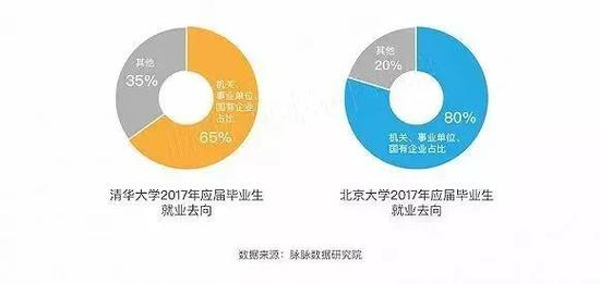 就拿2017年应届毕业生来说,65.3%的清华应届毕业生和80%的北大应届毕业生选择了机关、事业单位和国有企业。