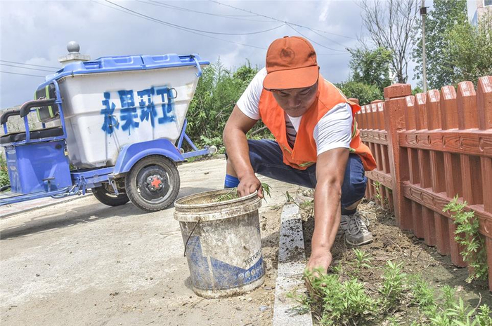 柴郢村长坝组贫困户罗月球在八岭湖景区担任保洁和安全工作,每月工资1700元。王绪波摄