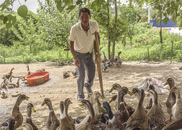 柴郢村黄冲组贫困户余同拄着拐杖进在林间饲养草鸡、麻鸭,饲养的家禽由八岭湖景区统一收购,帮助销售。王绪波摄