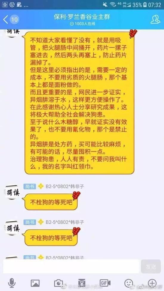 记者调查发现,也有人通过建立诸如名为“专业杀狗群”等QQ群传播“杀狗”攻略,甚至有人在超过千人的吉林省长春市某小区的业主群里详细描述如何使用“异烟肼”等“杀狗神药”。