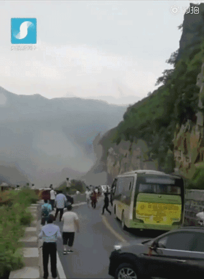 目击者称,开始时从山上不停地落小石头,山上往下小石头落得越来越快,落着落着大石头越来越多也开始往下落,但是并没有车辆被砸,因为小石头封路的时候,车和人都已经撤离得比较远了。