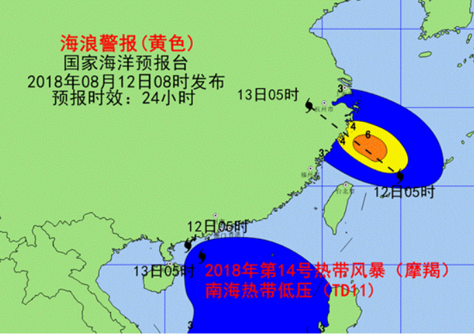 受今年第14号热带风暴“摩羯”的影响,预计:8月12日中午至13日中午,东海、钓鱼岛附近海域将出现4到6米的巨浪到狂浪区,近海海浪预警级别为黄色;浙江近岸海域将出现3到4.4米的大浪到巨浪,该近岸海域海浪预警级别为黄色;江苏南部、上海近岸海域将出现2到3米的中浪到大浪,该近岸海域海浪预警级别为蓝色。