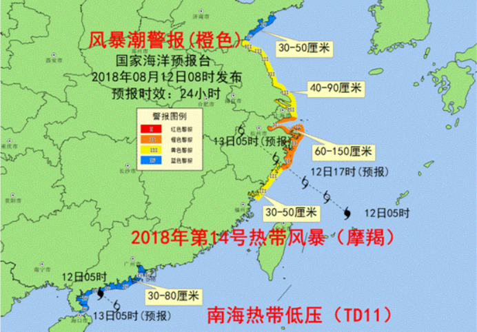 受南海热带低压(TD11)的影响,预计:8月12日上午到13日上午,广东珠江口到雷州半岛东岸沿海将出现30到80厘米的风暴增水。上述岸段内的广东赤湾、珠海、闸坡和水东潮位站将分别于12日和13日上午出现达到当地蓝色警戒潮位的高潮位。广东省深圳市、珠海市、阳江市和茂名市的风暴潮预警级别为蓝色。