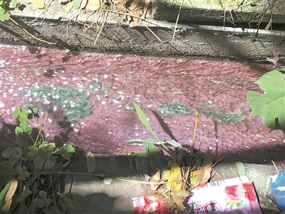 | 暗渠排水口在树叶的遮盖下不断排放着废水,让涌水变成了粉红色。 |