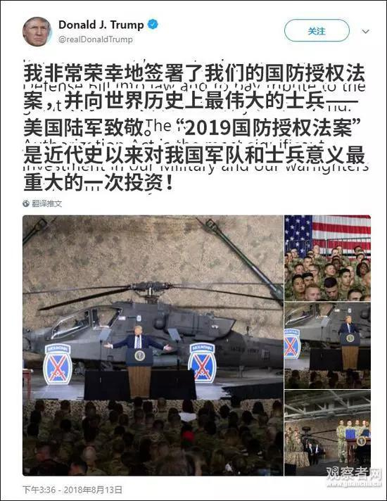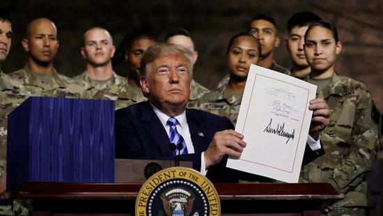 当地时间8月13日,特朗普在美国一处军事基地签署了2019年度国防授权法案,总额达到7160亿美元,增幅2.6%,是美国军费9年来的最大涨幅,创下伊拉克战争和阿富汗战争以来的新高。