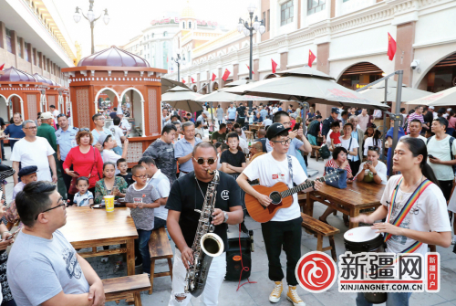 在大巴扎步行街C区“大巴扎美食街区”内,乐手的表演吸引游人驻足观赏。(记者陈星宇张利民摄)