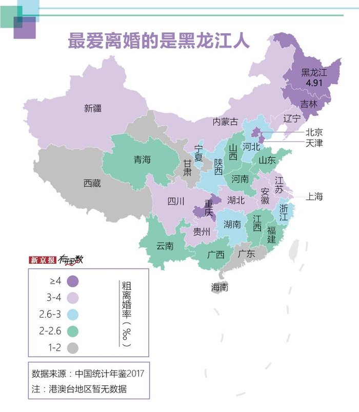 除了两性差异,对于离不离婚这个问题,地域间的差异也很明显。近年来,东三省的离婚率一直很突出,2016年,黑龙江省的粗离婚率高达4.91‰,排在全国第一,紧随其后的是北京、吉林、重庆和天津,当地的粗离婚率都超过4‰;而排在最后的西藏、甘肃和广东,三地粗离婚率都在2‰以下。