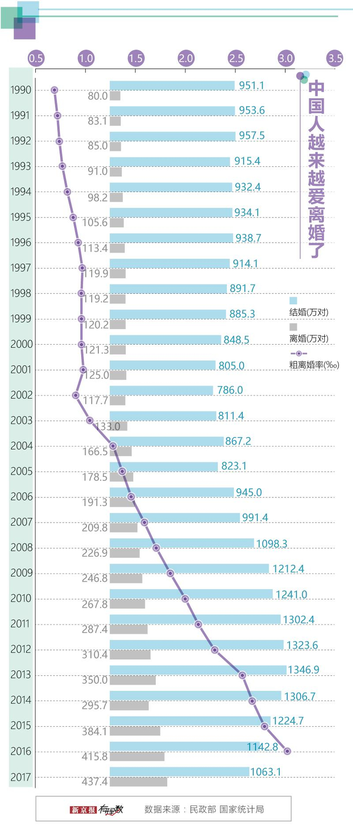 日前,民政部发布的《2017年社会服务发展统计公报》显示,2017年我国依法办理结婚登记1063.1 万对,比上年下降7.0%;办理离婚手续的共有437.4 万对,比上年增长5.2%。