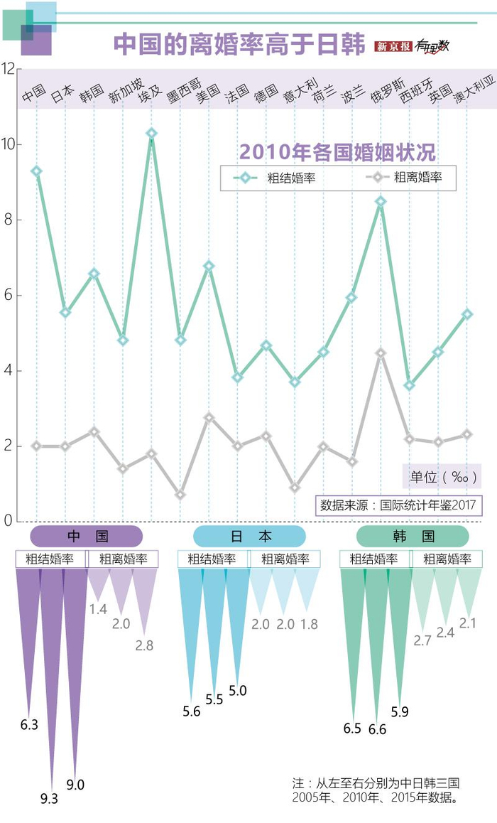 从全球角度看,在2010年,中国的离婚情况并不算严重。那时,中国的粗离婚率与日本持平,都是2‰,小于韩国的2.4‰;可到了2015年,中国的粗离婚率升至2.8‰,而同期日本和韩国的粗离婚率分别降至1.8‰和2.1‰。