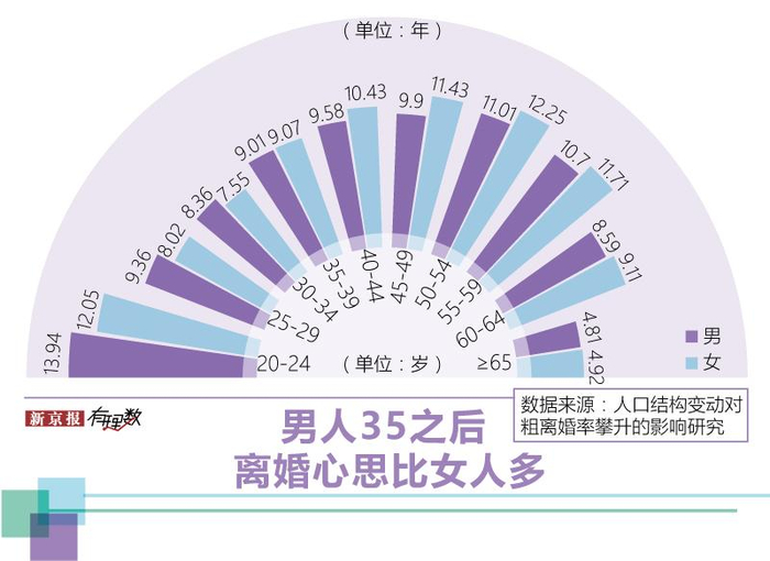 如果进一步看,中国人的平均婚姻寿命也在降低。此前有研究以各年龄别离婚率来计算夫妇预期的婚姻可维系年数,研究显示,2005年,国人的平均婚姻预期寿命为10.29年;2010年,平均婚姻预期寿命为9.59年,减少了0.7年。
