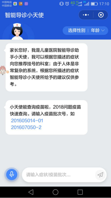 点击“智能导诊”后,选择性别、年龄等基本信息,就可以开始和“智能导诊小天使”对话了。院方供图 华龙网发