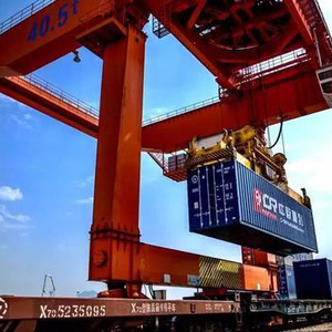 ▲资料图片:2017年4月15日,浙江义乌西站铁路口岸,工作人员正在向中欧班列(义乌-马德里)吊装集装箱。