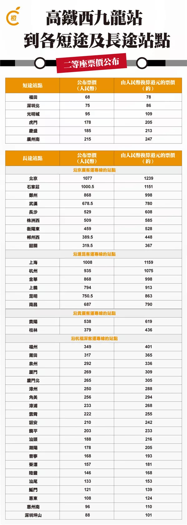据港铁公司介绍,深圳北站到香港西九龙站二等座公布票价为人民币75元;厦门站到香港西九龙站二等座票价为人民币269元,厦门北站到香港西九龙站二等座票价为人民币265元;福州站到香港西九龙站二等座公布票价为人民币349元。具体开始售票日期和售票方式将择日公布。