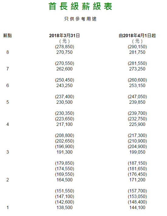 解释一下,香港公务员是根据所属职系和职级的薪级表支取薪酬的。香港政府共有总薪级表、警务人员薪级表、一般纪律人员(指挥人员)薪级表、一般纪律人员(主任级)薪级表、首长级薪级表、首长级(律政人员)薪级表、技术员学徒薪级表等11个公务员薪级表。