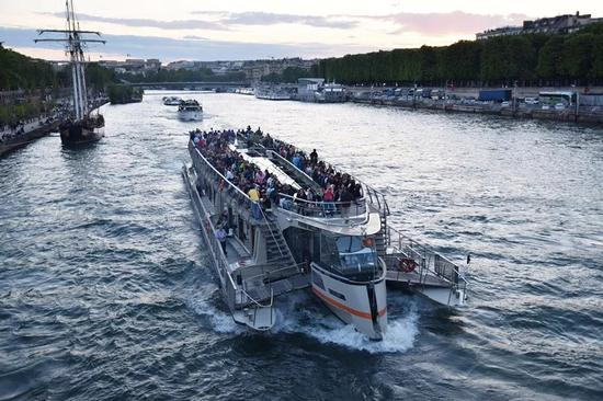 2016年5月7日,在法国巴黎,一艘满载游客的观光船行驶在塞纳河上。(新华社记者李根兴摄)