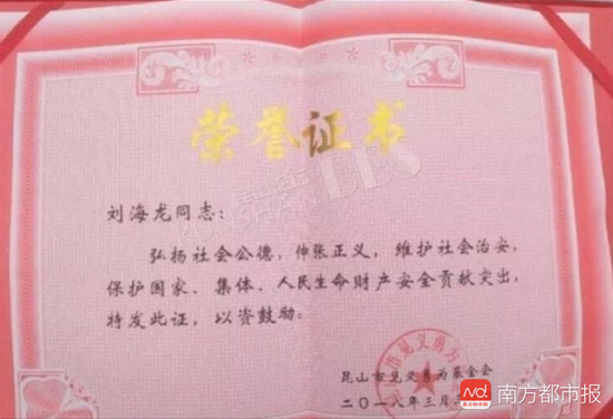 网上一张刘海龙于今年3月获昆山市见义勇为基金会颁发的证书被热传,证书显示“弘扬社会公德,伸张在争议,维护社会治安,保护国家、集体、人民生命财产安全贡献突出”。