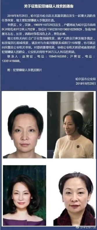 29日下午,哈尔滨市公安局发布犯罪嫌疑人线索征集通告指,主要犯罪嫌疑人、53岁的李艳滨在逃。《中国新闻周刊》记者于当晚8时30分左右探访了通告中显示的李艳滨居住地,但该住所无人应门。邻居表示,近一年来这里几乎无人居住。