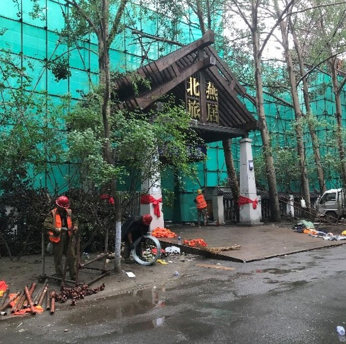从航拍视频中看到,位于酒店东北角的E区烧毁严重。目前正在清理中,但酒店东门“北燕旅居”和“随缘艺家宾馆”的牌子仍保存完好。