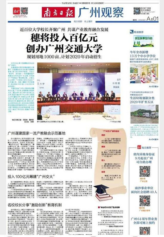 记者从会上获悉:广州将投入百亿元创办广州交通大学。目前,筹建工作已经展开,筹划用地1000亩,计划2020年启动招生。