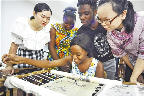 江西省新余市渝水区城北办长林社区夏布绣博物馆,来自赞比亚籍留学生罗仁思(中)在学习中国非遗夏布刺绣技艺,感受中国传统刺绣文化。 周 亮摄