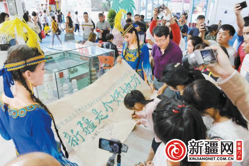 8月30日,在会展中心室内展馆新疆特色旅游商品展示区,观众在桑皮纸上写上自己的签名,祝福新疆越来越好。 (记者陈岩摄)
