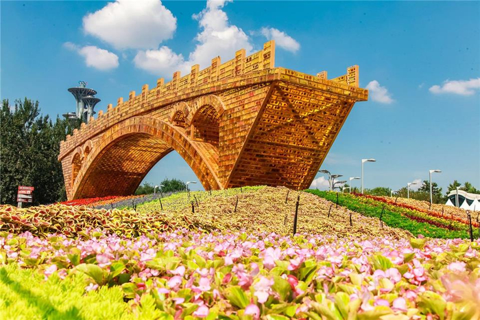 “丝路金桥”景观雕塑以中国最古老的赵州桥为外形,由2万块“长城砖”大小的金色人造树脂水晶砖砌成,全长28米、高7米、宽4米,由700多名工匠历时一整年完成。“赵州桥是千年古桥,建造技术处于世界顶级水平,直到现在还在使用,它体现了中国的工匠精神,也具有承上启下的历史感,从审美上来说,这座桥简洁、大方,为人熟知,它的拱形像彩虹,有‘虹桥’之意,虹桥则代表美好希望之桥,适合作为文化载体。”在“丝路金桥”每块砖的内部则是用熔铸丝绸制作的手工花,是陆上和海上“丝绸之路”沿线几十个国家、近百座城市的“国花”或“市花”,意味着百花齐放、世界和谐。舒勇表示,国花是一个国家的文化符号,也代表了这个民族的性格,把国花融在一起,就体现了你中有我、我中有你的共享精神。