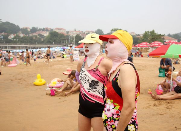 在青岛第一海水浴场,游泳的人们戴上“脸基尼”防晒。