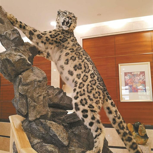 雪豹大会会场外展示的雪豹标本栩栩如生。
