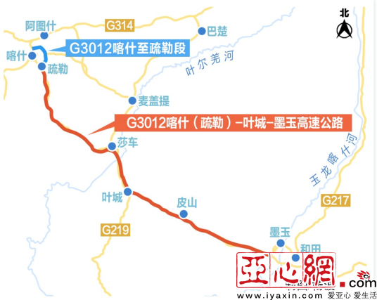 喀叶墨高速公路项目全长434.314公里,起于疏勒县南,与G3012喀什至疏勒段高速公路(在建)终点相接,止于墨玉县西南,与G3012墨玉至和田段高速公路起点相接。项目于去年7月份开工建设,采用双向4车道高速公路标准建设,设计速度120km/h、100km/h。