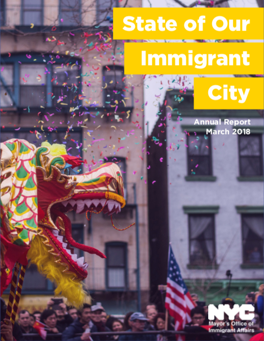 (图片说明:纽约市市长移民事务办公室在2018年3月发布的年度报告中盛赞外来人口为纽约经济作出的贡献:2017年移民为纽约市的GDP贡献了约1950亿美元,约占该市GDP总量的22%。详见NYC MOIA, State of Our Immigrant City, 2018)