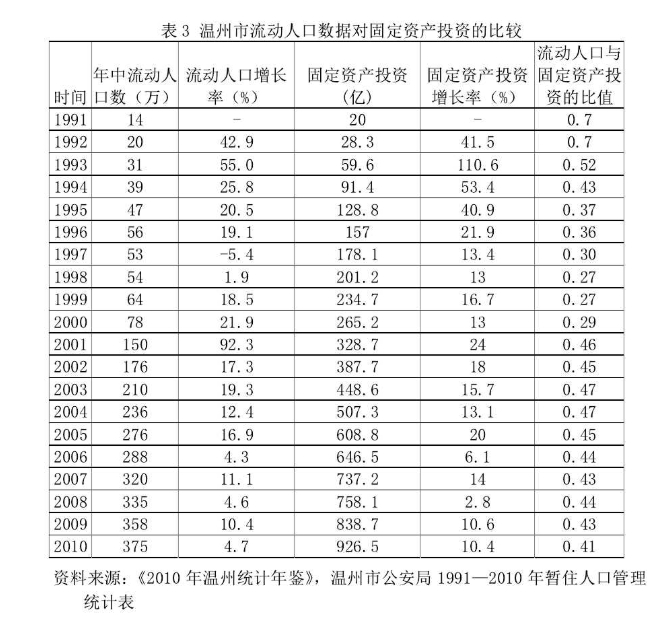 根据姜春芽(2014)的研究,温州市流动人口对固定资产投资的影响,基本上是随着流动人口数量增长而增长;而在人口流动人口减少的年份,固定资产投资增量也趋缓。