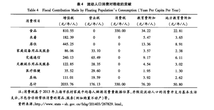 张力(2015)的研究认为,虽然流动人口中有大量并未参加社保或者缴纳个税,但是流动人口的消费对于地方税收的贡献仍然非常可观。