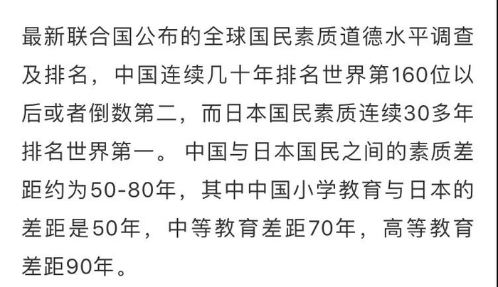 该网传文章声称:“最新联合国公布的全球国民素质道德水平调查及排名,中国连续几十年排名世界第160位以后或者倒数第二,而日本国民素质连续30多年排名世界第一。”