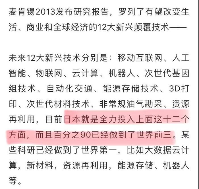 譬如,该文援引全球知名咨询公司麦肯锡2013年发布的研究报告,称“12大新兴技术,日本百分之90做到世界前三”。