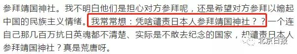 更使用煽动性的文字,污蔑中国“连几百万抗日英雄都不清楚”,“不敢纪念”,所以没资格去谴责日本人参拜靖国神社。